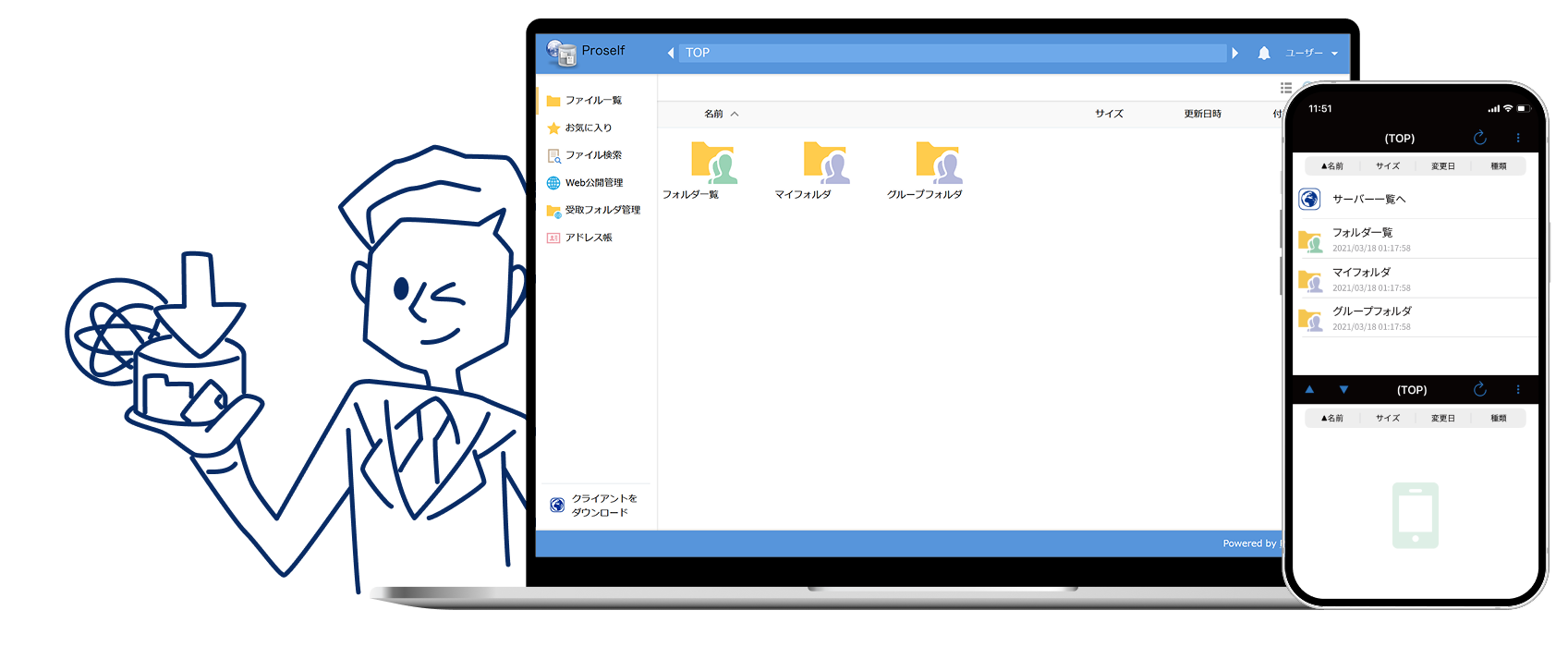 [Proself]は、ファイル共有・受け渡しのための法人向けクラウドストレージ(オンラインストレージ)です。